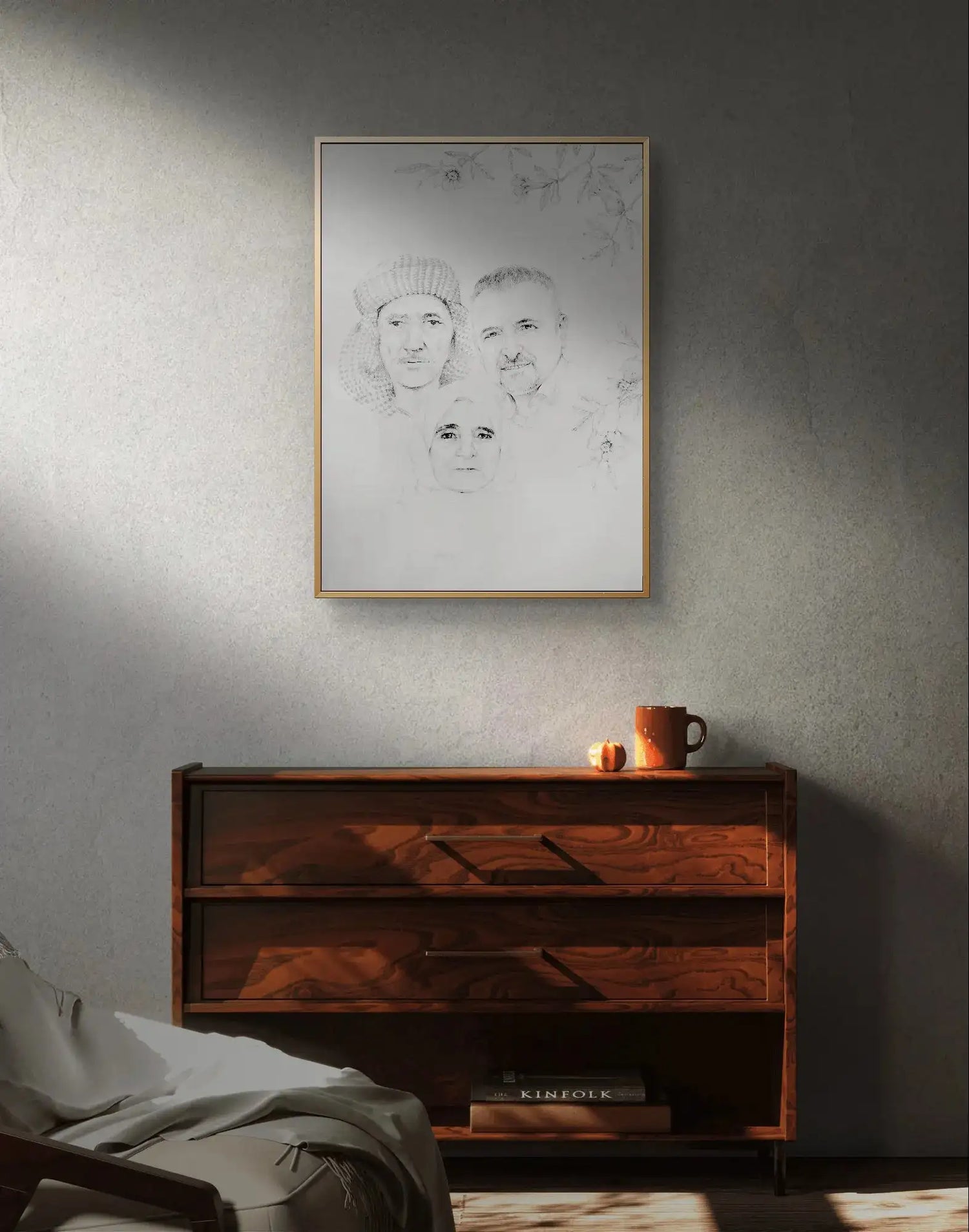Un intérieur rustique, encadré d'un portrait de famille dessiné à la main au crayon.