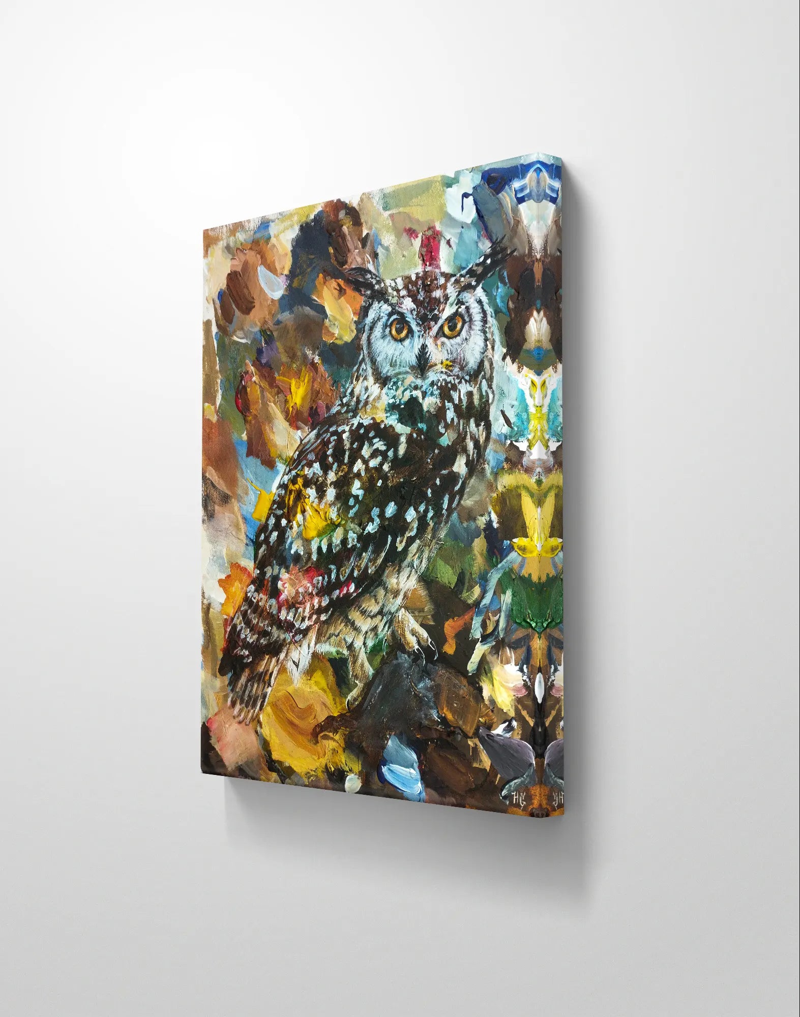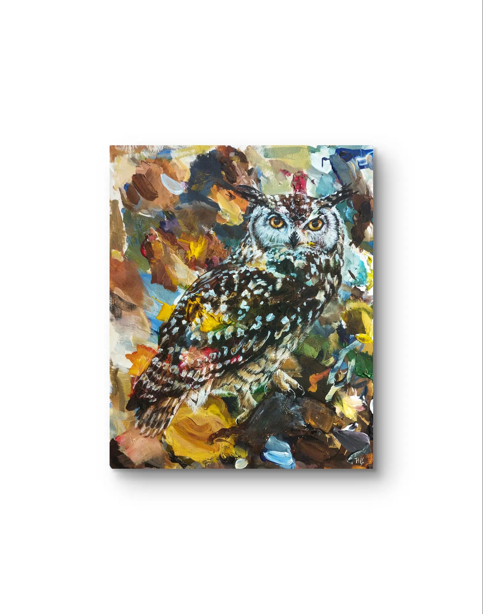 Inspiriert vom geheimnisvollen Charme und der Weisheit der Eule, strahlt dieses Werk Freude und Wärme aus. Die farbenfrohe Komposition lädt zum Schmunzeln ein und verschönert jedes Zuhause, Büro oder jede Galerie mit ihrer einzigartigen Präsenz.