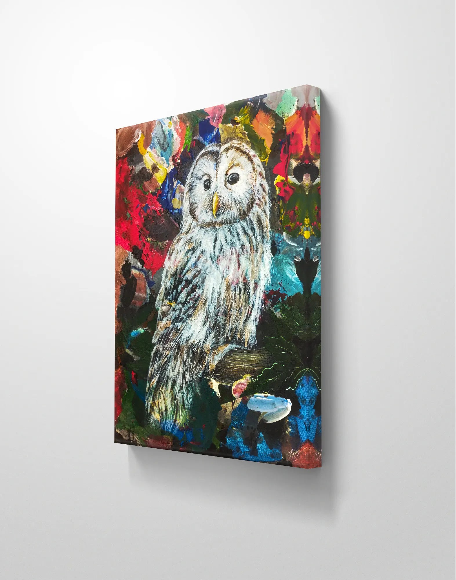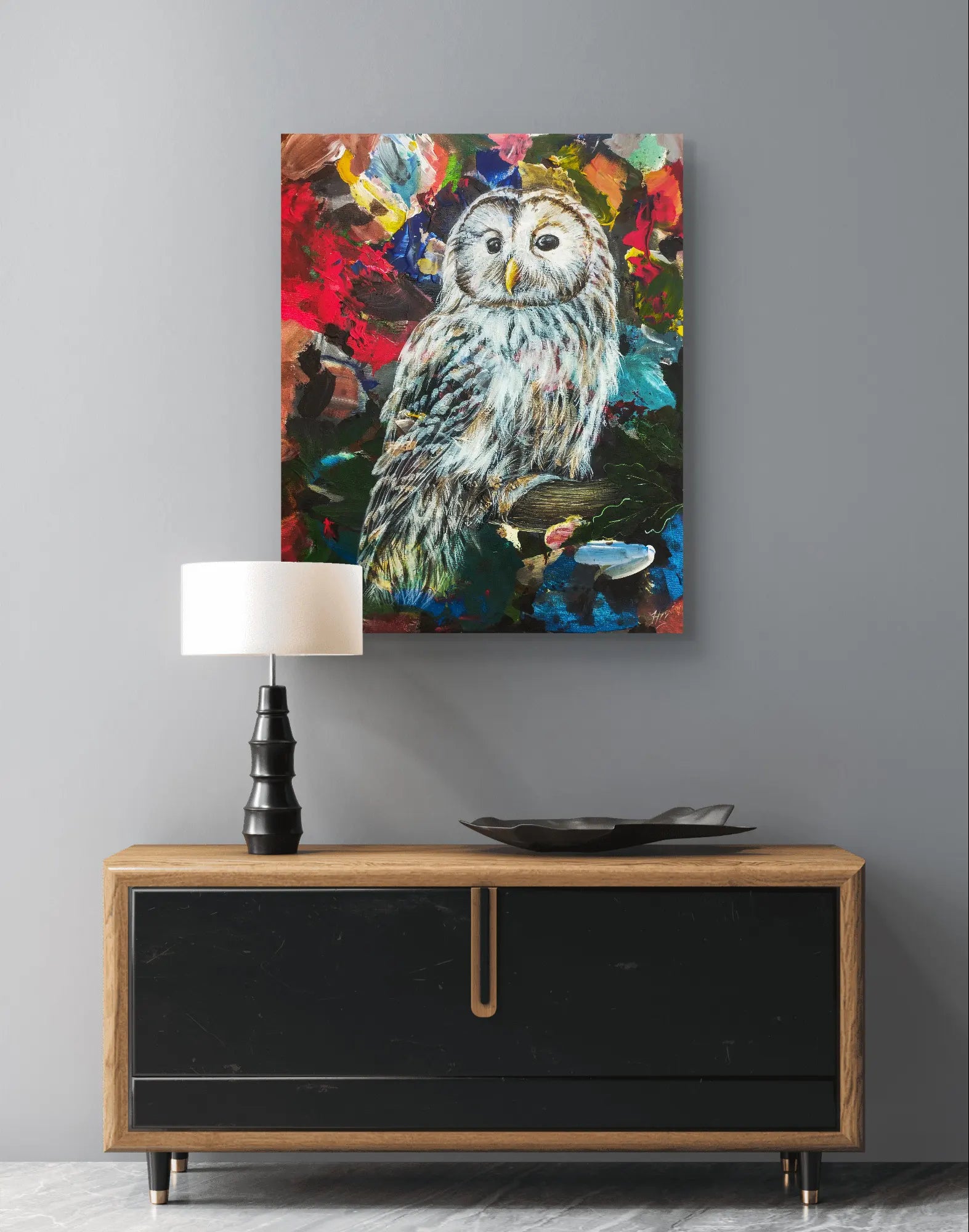Inspiriert von der natürlichen Anmut und Weisheit des Waldkauzes strahlt dieses Bild Lebensfreude und Wärme aus. Die farbenfrohe Komposition lädt zum Lächeln ein und verschönert jedes Zuhause, Büro oder jede Galerie nachhaltig.